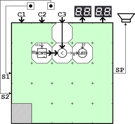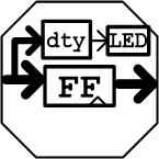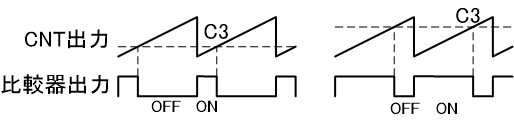 8bitカウンタなので256サイクルで元に戻ります。比較器の出力はLEDに接続して、比較器の一方の入力を定数値C3に接続します。カウンタの値がC3よりも小さい場合にHレベルを出力します。従って出力はデューティー比がC3/256で、周期はクロック周波数/256になります。
