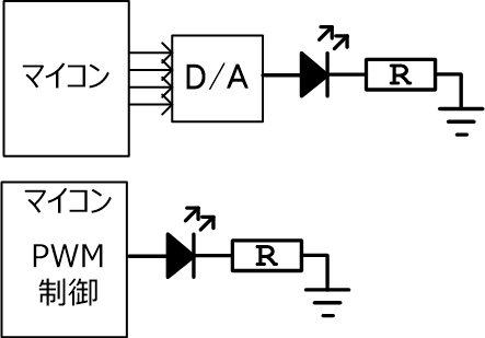 電圧をマイコン等でコントロールするにはD/A変換器が必要になりLEDの数分D/Aが必要になりちょっと面倒です。そこでPWMの登場です。LEDへの印加電圧は一定ですが、OnとOffの比率を変えて平均的な光量を変える作戦です。