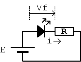 LEDの明るさはLEDに流す電流の量で決まります。LED(Light Emitting Diode)はその名の通りダイオードなので、一方向にしか電流が流れません。そして電流が流れているときにはダイオードのアノードとカソードの両端はほぼ一定の電圧(順方向電圧Vf)になります。おおよそ赤LEDで2V、青LEDだと3Vくらいです。図のような回路の場合、電流は、 i = (E-Vf)/R になりますので印加電圧Eによってiさらには明るさを変えることができます。